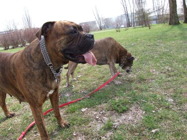 Tygra waży koło 35-36 kg, Brenda około 24kg - schudła babunia jeszcze. Brendzia czasem nawet biega, uparta jak osioł - czyli bez zmian. Jestem w szoku że ona w lipcu skończy 16 lat, a ma jeszcze sporo energii. Tyrga skończyła już latka i troszkę z zachowania się zmieniła - zdarza się jejczasem nie polubić jakiegoś pieska, co wcześniej się raczej nie zdarzało. Do zabawy chętna jak zawsze, ale teraz woli z pancią. Jakiś czas temu zaczepiała ją do zabawy młoda ON-ka, a Tygra przygniotła ją do ziemi i warczała jak głupia.